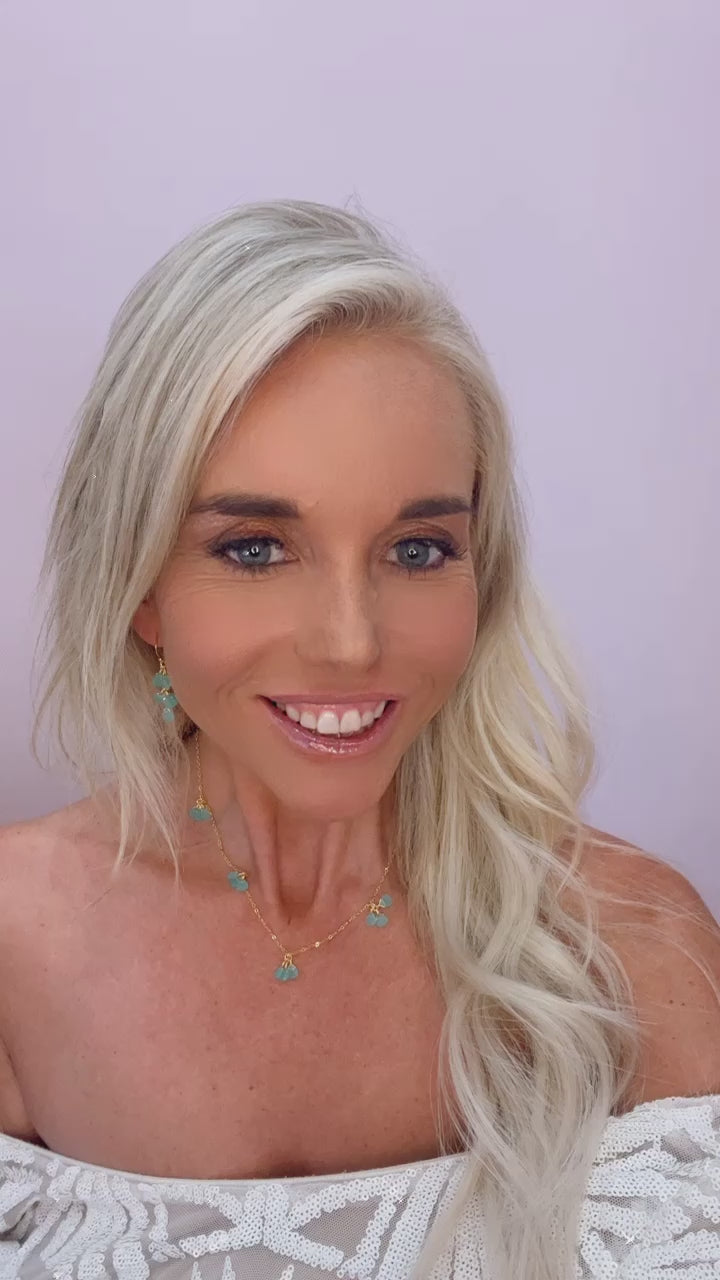 A dainty necklace in gold with clusters of 3 hand wrapped chalcedony stones.