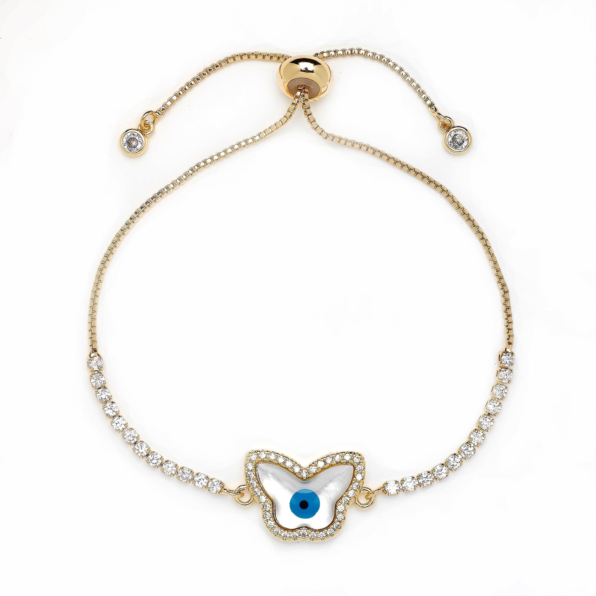 A rhinestone-studded butterfly mother of pearl pendant attached to a gold rhinestone and chained bracelet.
