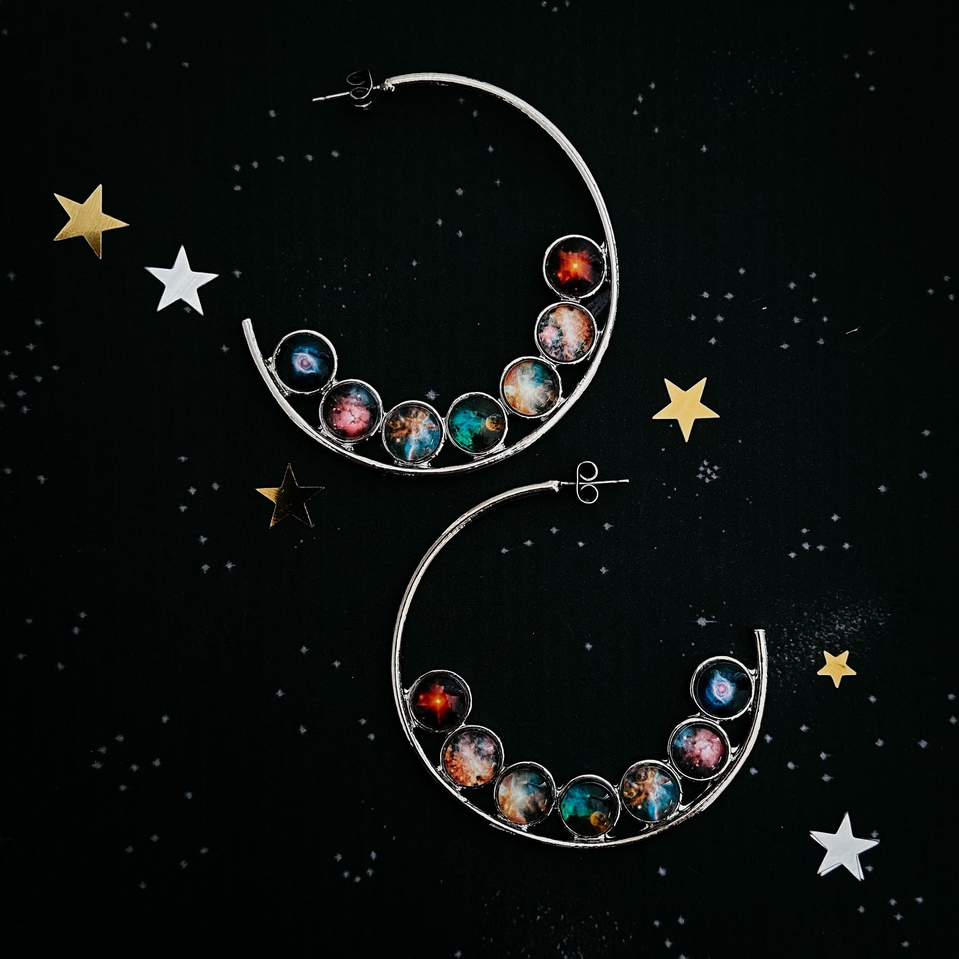 These earrings are the dream for any cosmic lover! Stunning hoops that make quite a statement! Silver tone with the cosmic images set in the front, and the back is the textured metal. Featuring 7 b eautiful nebulae set in such a fashion as to harken to the ROYGBIV of a rainbow. The best part? 10% of the proceeds from this piece get donated to to help LGBTQIA+ people escape state-sponsored violence and oppression.