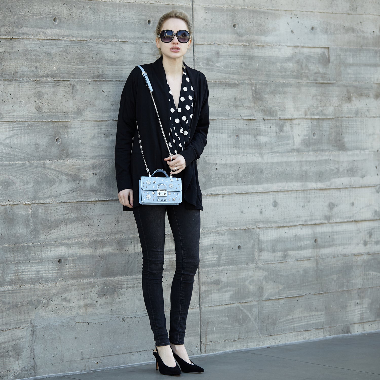 The Hollywood purse is as stylish as it is practical. The bold silver metal stud detailing on the light blue leather creates a trendy, modern design, while the push-lock closure ensures both security and elegance in one compact bag.